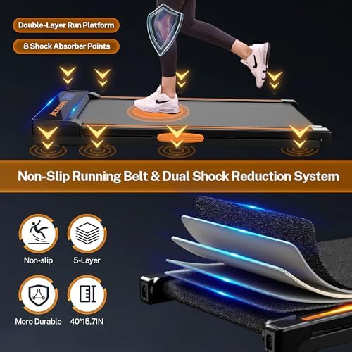 Non-Slip Running Belt & Shock Reduction System: The 5-layer anti-slip running belt and shock-absorbing column support design can greatly absorb the impact caused by exercise and provide protection for knees, muscles and ankles. Walking pad under desk treadmill uses a turf textured running belt with a shock-absorbing and anti-slip design, which can maintain its wear-resistant properties even under long-term and high-frequency use.