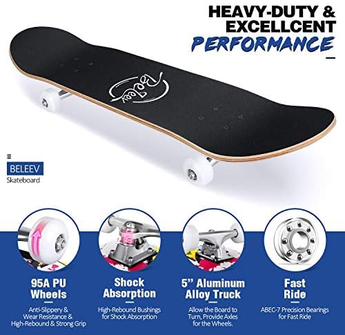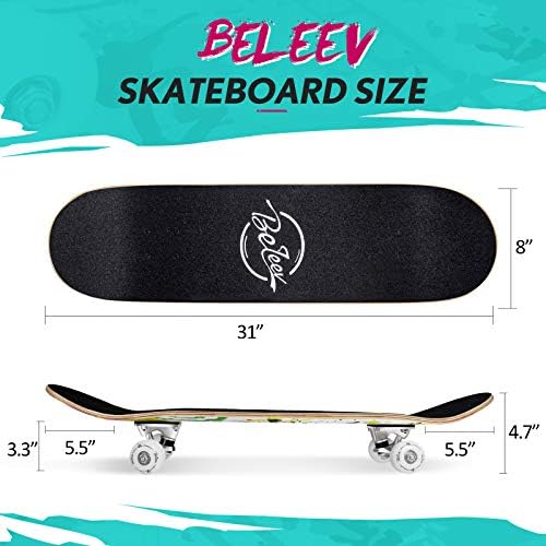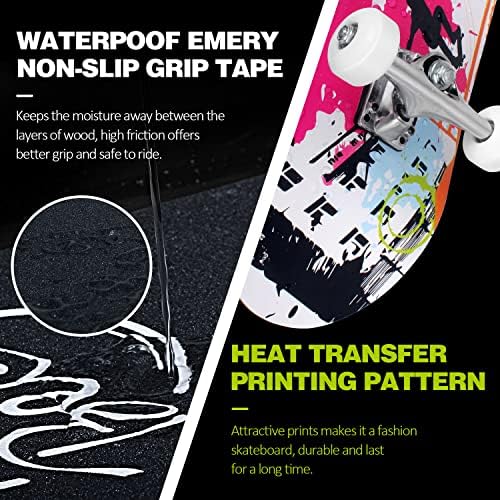 Beautiful and Durable Printing: The color and graphics design on the board is quite creative and eye-catching, you will definitely stand out among your friends across the different age range. Also, the pattern is printed with Heat Transfer Printing onto the board, durable and last for a long time. This should be your best pick for the best skateboard no doubt!