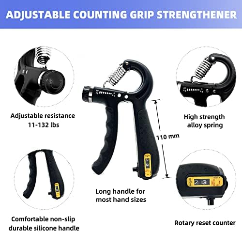 【Adjustable resistance countable grip】The resistance range of the hand strengtheners is 11-132 pounds (5-60kg), meeting the needs of people of all ages, and you can turn the knob to adjust the resistance value. The counter at the bottom of the grip can count up to 99, then reset to zero, and you can manually adjust the reset.