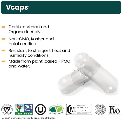 Vcaps are made of just two components: plant-based HPMC and water. They are a globally acceptable primary vegetarian capsule, and in Europe, they are suitable for use with organic ingredients. They are Non-GMO, Kosher and Halal certified.