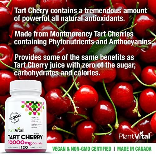 THE POWER OF POTENCY: Our vegan Tart Cherry product is equivalent to 10,000mg (10:1 ratio) per 2 capsule dosage – one of the highest on the market. Real strength – great value! Also vegan, non-GMO, additive free and made here in Canada.