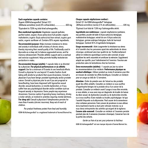 Ashwagandha from Webber Naturals provides organic KSM-66 Ashwagandha® to help increase resistance to stress and anxiety in individuals with a history of chronic stress. This herb is also used in herbal medicine as a natural, non-habit-forming sleep aid to balance aggravated nerves and enhance memory.Ashwagandha provides athletic support, helping to improve physical performance when combined with regular resistance training. This herb is also used in herbal medicine as a rejuvenative tonic and to relieve general debility, especially during convalescence and older age. In addition, it helps support libido and promote healthy testosterone production in males.Organic KSM-66 Ashwagandha is a full-spectrum extract made from only the ashwagandha root without the use of alcohol or chemical solvents. KSM-66 is one of the most clinically studied ashwagandha root extracts available, offering the same potency as used in multiple clinical studies.Ashwagandha from Webber Naturals is non-GMO and suitable for vegetarians and vegans. Only one capsule per day provides a 600 mg dose equivalent to 7200 mg of dried ashwagandha, standardized to 5% of withanolides.
