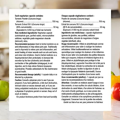 Raw Herb Calculation: Each vegetarian capsule delivers 550 mg of turmeric powder and 50 mg of turmeric extract standardized to 95% of curcuminoids (50 mg of 50:1 extract = 2,500 mg of raw herb + 550 mg raw herb = 3,050 mg raw herb)