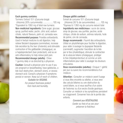 Turmeric curcumin vegan gummies from Webber Naturals offer a delicious and convenient way to enjoy turmeric’s many health benefits. Turmeric root provides antioxidant protection and is used in herbal medicine as an anti-inflammatory to help relieve joint inflammation and pain, and support digestion. Each gummy contains 105 mg of a 12: 1 turmeric extract standardized to contain 30% curcuminoids, the active constituents of turmeric root.